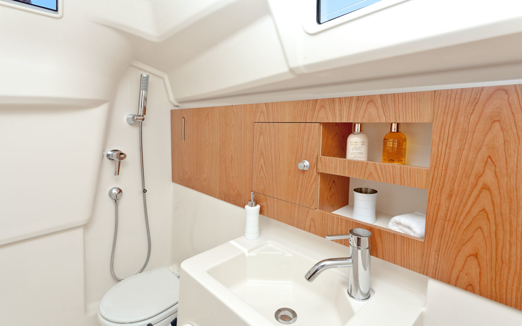 A fedélzeten kézzel foghatóvá válik az „ügyes térkihasználás” kifejezés. Az önváltós fock ékes bizonyítéka annak, hogy a gyár nem csak beszél a „könnyű kezelhetőségről”. A nagyvitorla behúzója szinté sínen mozog, így a grósz állíthatósága jobb azokhoz a hajókhoz képest, ahol ilyen megoldás nincs. Bár a tat nyitott, a cockpit védettnek tekinthető, már csak azért is, mert a lehajtható fürdőplatform zárja le a teret. Amikor épp nem, akkor pedig jó szolgálatot tesz, mint gyerekeknek szánt játszótér vagy napozóterasz. Odabent világos és tágas a tér.